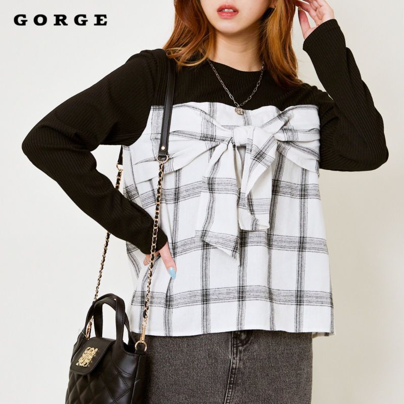 1枚で簡単にレイヤードスタイルが完成するドッキングリボントップス。大きめリボンがアクセントになったデザインで、シンプルながらも存在感のあるアイテムです。