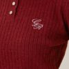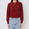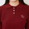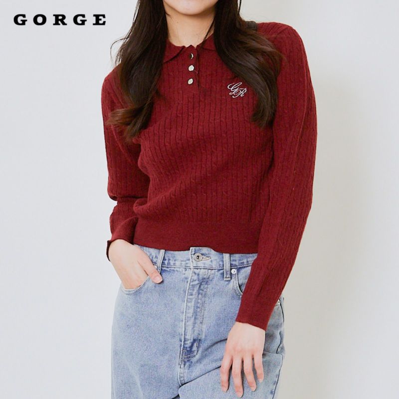 襟付きのデザインで、クラシックな雰囲気を醸し出しつつ、フロントの刺しゅうが柔らかい印象を与えます。シンプルなニット素材ですが、刺しゅうの細部にこだわりが感じられ、華やかさを加えることができます。