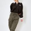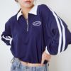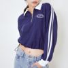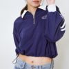スポーティーでありながらも女性らしさを感じさせるライン襟付きドローコードプルオーバー