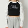 配色のラグランデザインがアクセントとなった、1枚で決まるクロップド丈のロンTが登場★フロントにあしらったラインストーンのロゴがレディなアクセントを添えるアイテム♪コンパクトなサイズ感で女性らしいシルエット◎デニムはもちろん、カーゴパンツやショートパンツとの相性がよくストリートからカジュアルまで幅広く着ていただけます☆