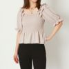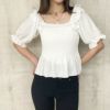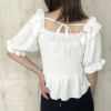 身頃のシャーリングデザインがポイントのスクエアネックブラウスが登場★袖はバルーンスリーブにフリルでふんわり可愛らしい雰囲気に◎コンパクトな丈感でボトムとのバランスもとりやすく、裾のフリルが腰位置を高めに見せてくれるのでスタイルUPも♪シンプルにデニムやベーシックなカラーのボトムス合わせがおすすめです☆