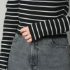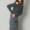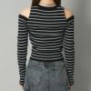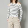 肩あきデザインと細ボーダーが組み合わさった、抜け感たっぷりのニットトップス。