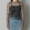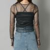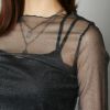 キラキラしたラメをたっぷり織り込んだ素材が煌びやかな雰囲気の長袖トップスとキャミソールのセット。旬のシアーデザインで大人顔にアップデート。すっきり開いたネックラインや袖口にあしらったメロウデザインがアクセントに。