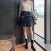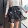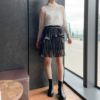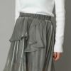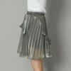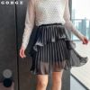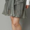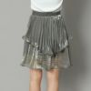 大人のかわいさを醸すシャイニーミニスカート。プリーツを施したティアードデザイン。大人っぽく楽しめるように、プリーツ幅は細かく、洗練されたムードに仕上げました。たっぷりの生地感とイレヘムデザインから生まれる、ドラマティックな揺れも魅力的。ウェストゴムで着脱も簡単。