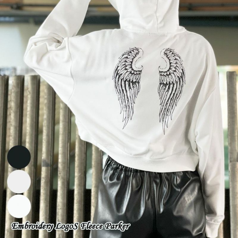 背中の羽が天使のようなデザインの刺しゅうロゴショート裏毛パーカーが登場★ショートタイプの丈感でスタイルアップも期待できるアイテム♪丈感をアピールするならハイウエストのボトムと相性バツグン◎シンプルで大人なルックがシックな印象もあるのでコーデ振り幅の広いアイテムです☆