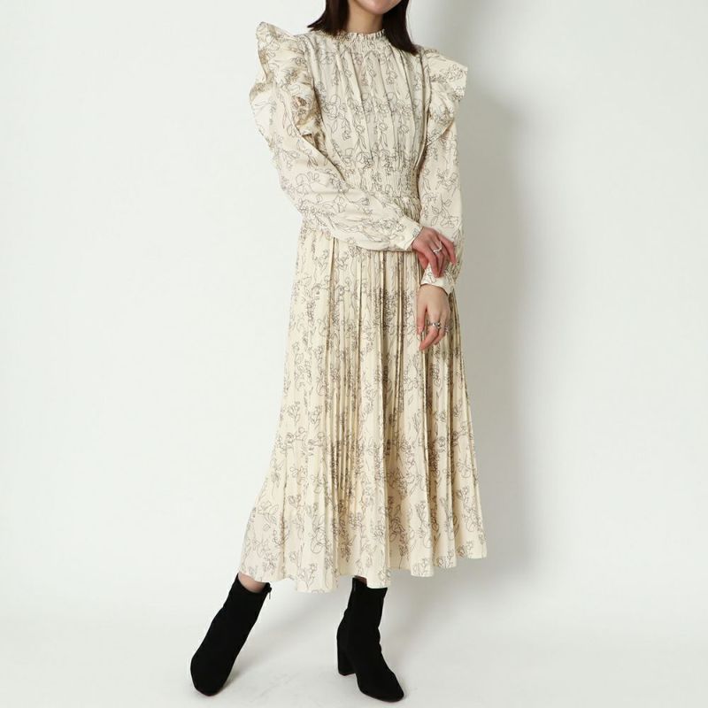 手描きイラストのようなデザインがキュートな花柄フリルシャーリングワンピースが登場★上品でお姉さま風の印象が一目でつくアイテム♪カジュアルランチも少しかしこまった席も着ていける◎肌寒い時期からは重めのアウターで甘辛MIXもGOOD☆