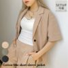 メンズライクな少し長めの半袖が大人っぽい印象のコットンライクジャケットが登場★開襟のデザインで顔周りをすっきりみせてくれる♪セットアップではもちろん、デニムパンツやスキニーパンツなどを合わせるなど単体でもコーディネートが広がる◎ショートパンツ(2323576)とセットアップでもご着用していただけます☆