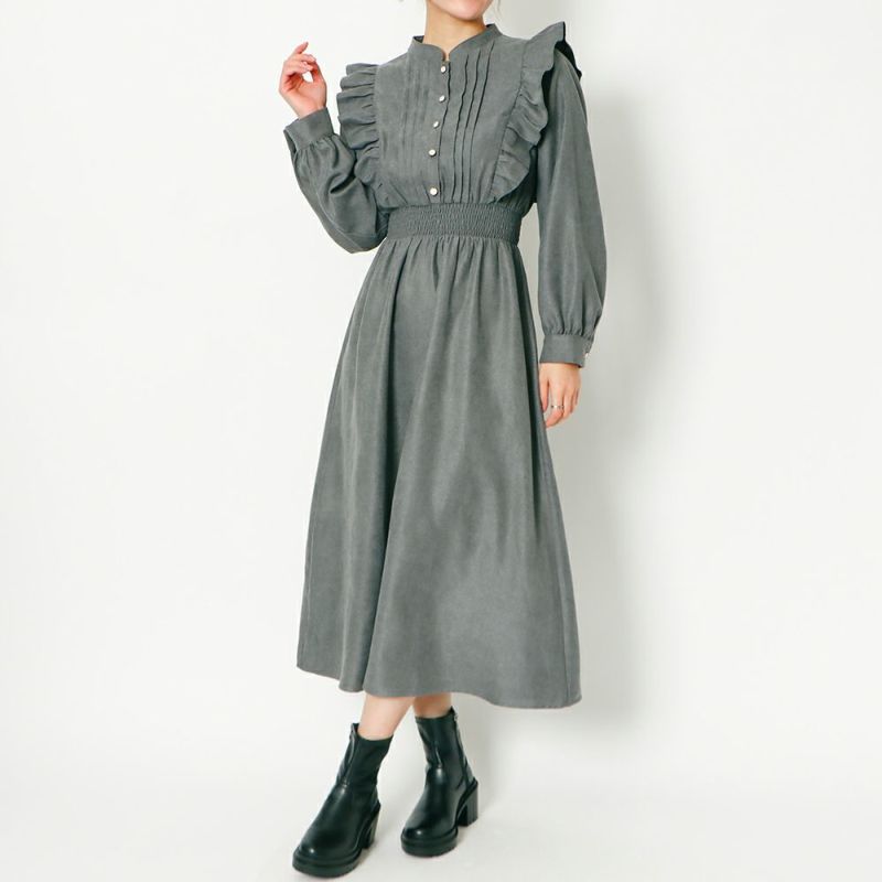 レトロな雰囲気漂うシーズンライクな素材のフリルワンピース。