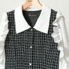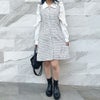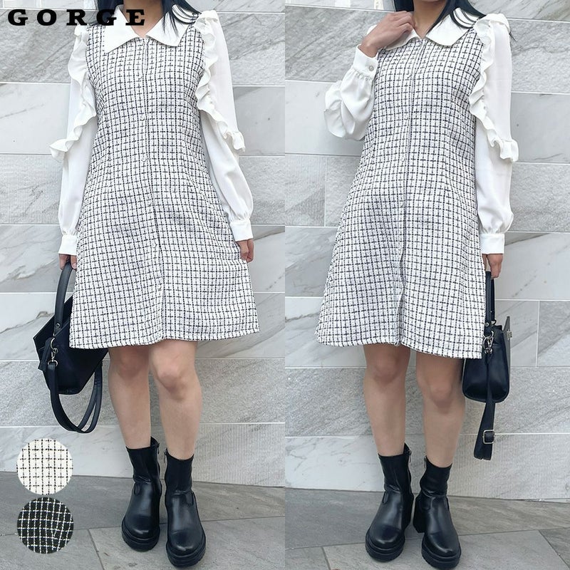 ツイードとブラウスのドッキングが可愛いワンピース。袖のフリルが女の子らしさ抜群。春先まで長く使えるアイテムです。