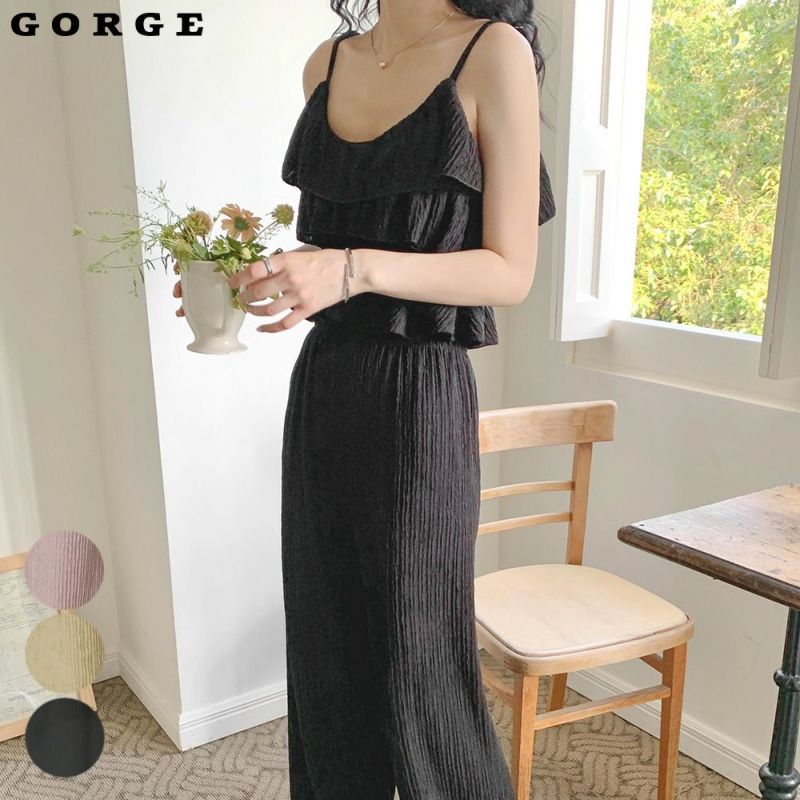 フリルが可愛いキャミソールとパンツのセットアイテム。柔らかく動きのある生地感に3段フリルのボリューム感あるキャミソールは存在感抜群◎パンツは着丈が長めなのでショート丈アイテムと相性ピッタリです。セットアップでももちろん着回しもできるのでコーデの幅が広がります。