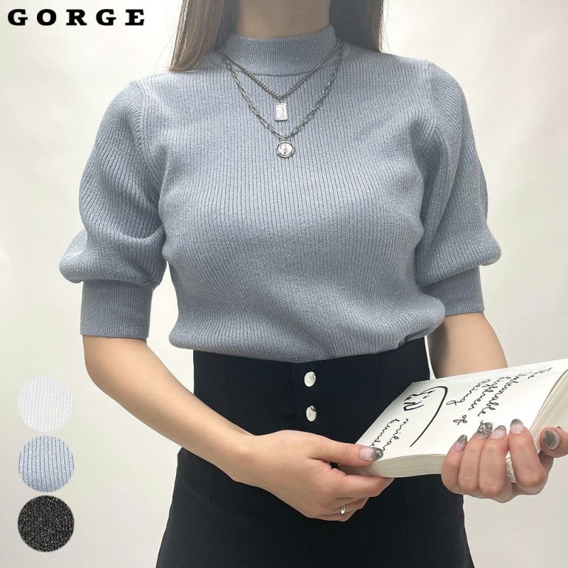 細かなラメがトレンド感のあるリブニットトップス。ハイネックとふくらみのある袖で華奢見えが叶います★キレイめ女っぽコーデにオススメです!