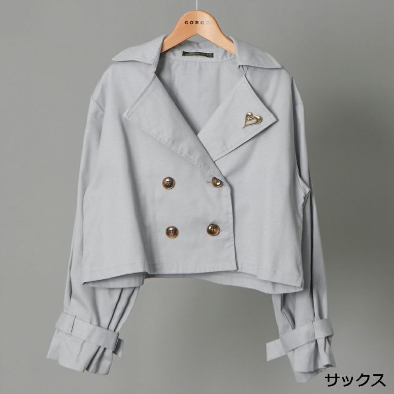 季節の変わり目の羽織りにちょうどいい、裏地の無いショートトレンチジャケット。袖口のキャンディースリーブやバックスタイルのプリーツ切り替えで、マニッシュになりがちなトレンチをフェミニンな印象にアップデート。襟元の開きを大きく設定する事で、顔周りをスッキリ見せてくれる効果も◎付属のブローチ華やかなインパクトもプラス。