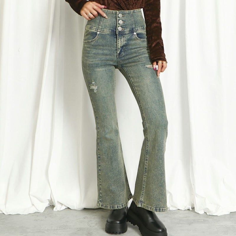 美シルエットを叶えるハイウエストフレアパンツ。3つボタンデザインでしっかり股上の深さがあるのでショート丈のトップスとの相性抜群♪フィットフレアのシルエットで膝下の脚のラインを自然にカバーしてくれるので脚をキレイに見せてくれます。ビンテージ風の色味の加工も今季らしい雰囲気を出してくれるポイントです。