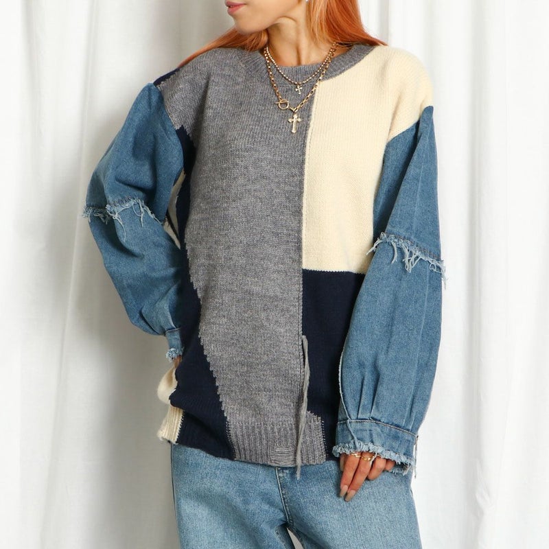 ニットとデニム生地の異素材ミックスのコンビネーションが、主役級のニットプルオーバー。配色デザインとダメージ加工で遊び心満載のアイテムです!ベーシックなボトムスにオンするだけで個性的で洒落たコーデの完成☆