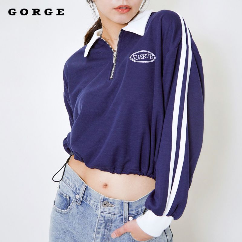 スポーティーでありながらも女性らしさを感じさせるライン襟付きドローコードプルオーバー