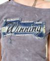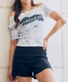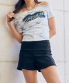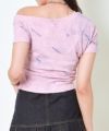 やや広めのネックラインでデコルテを綺麗に見せつつ、カジュアルな印象に。フロントに施されたデニム×プリントのワッペンは、切りっぱなし風のラフな仕上がりが魅力で、コーデにスパイスをプラス。ピンクのボディカラーとダメージ加工のバランスも絶妙で、甘すぎず程よくエッジの効いた一枚です。