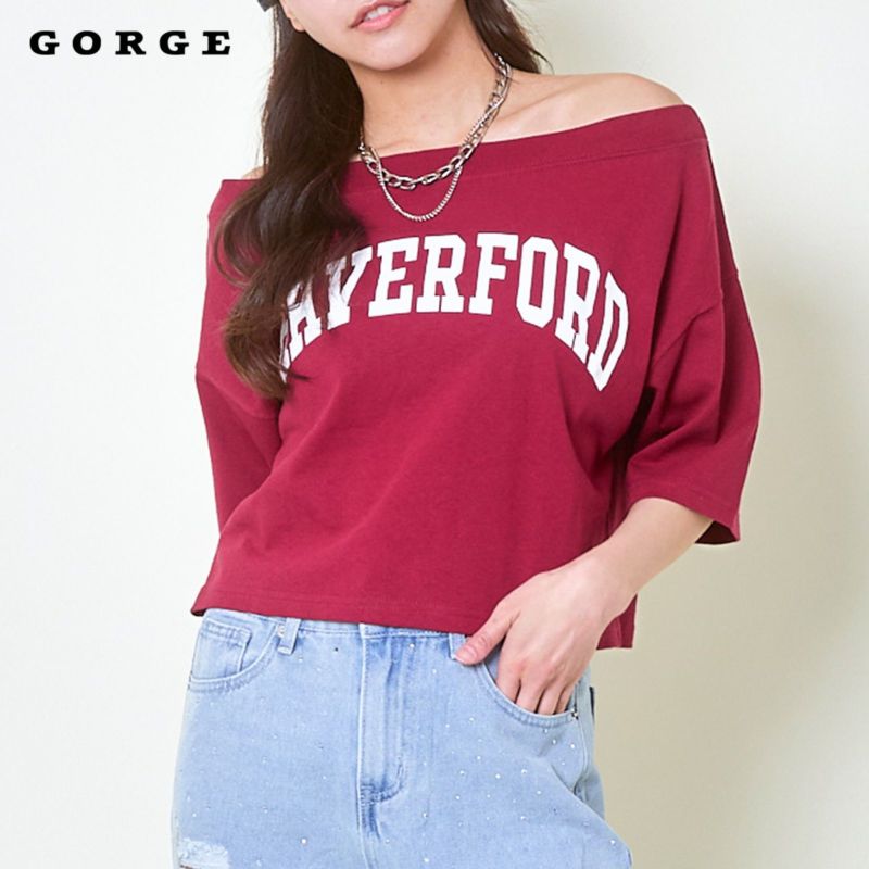 フロントには“クラックプリント”と呼ばれる、ひび割れ風の加工が施されたロゴがデザインされており、ヴィンテージ感のある風合いがポイント。こなれた印象を与えつつ、シンプルなTシャツとは一味違う個性を演出してくれます。オフショル仕様で片方の肩を軽く見せるシルエットは、ラフなのに女性らしい抜け感があり、着るだけでおしゃれ度がアップ。