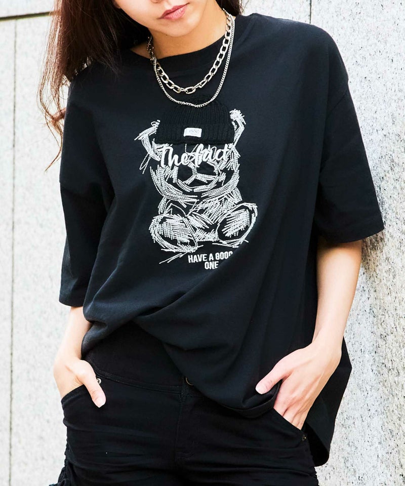 ゆるっとラフな着心地に遊び心がぎゅっと詰まった、トレンド感たっぷりの1枚。フロントには立体的なクマの刺繍が大きくあしらわれており、なんとそのクマが本物のニット帽をかぶっているというサプライズなディテールがポイント!まるでぬいぐるみのような愛らしさで、着るだけでハッピーな気分にしてくれるアイテムです♪