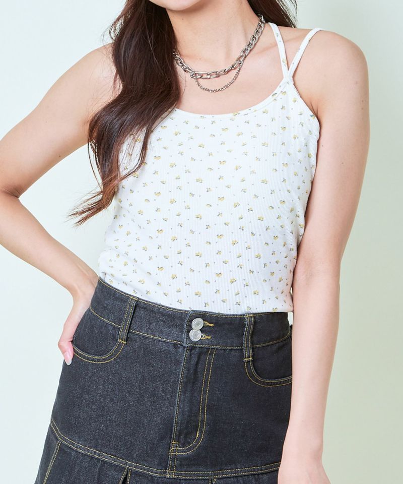 細かな花柄とリブ素材の組み合わせで、ナチュラルかつフェミニンな仕上がりに。華奢なダブルストラップとバッククロスがアクセントになって、上品さもありながらトレンド感も抜群。パット付きなので1枚でさらっと着られて、暑い季節にもぴったりです。
