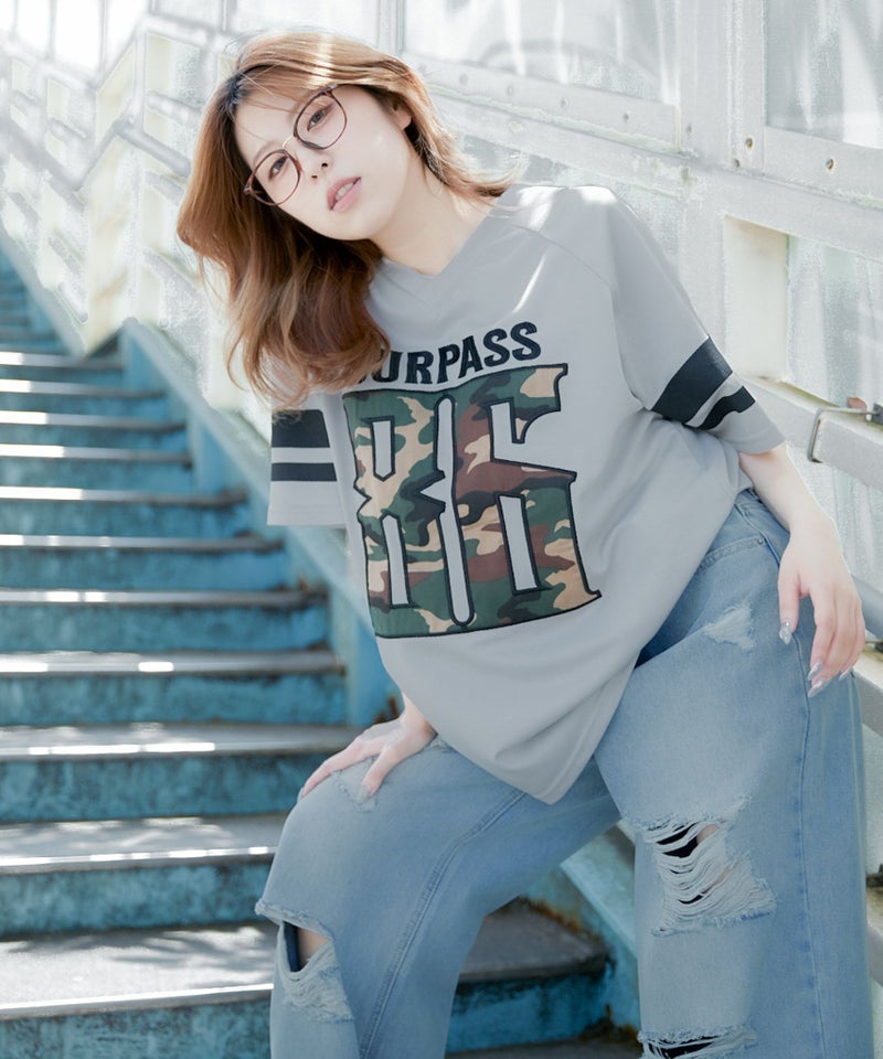 存在感のあるナンバリングとミリタリーテイストの迷彩柄が絶妙にマッチした、1枚で主役級のアイテム。