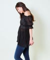 細かいプリーツが生み出す立体感と、ふんわり広がるシルエットが印象的。オフショルダーで肩まわりをすっきり見せつつ、シャーリング仕様で着心地も◎袖には程よいボリュームがあり、フェミニンなムードを演出します。