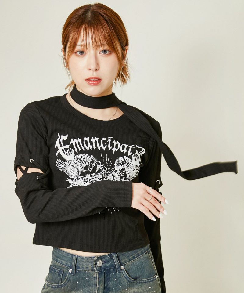 柔らかく伸縮性のあるリブ素材が、ほどよく体にフィットしながらストレスフリーな着心地に。大胆なプリントが印象的なフロントデザインに加え、袖部分のレースアップや取り外し可能なストール付きなど、他にはない個性が光るディテールが満載です。抜け感と存在感のバランスが絶妙で、1枚で着映えします。