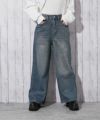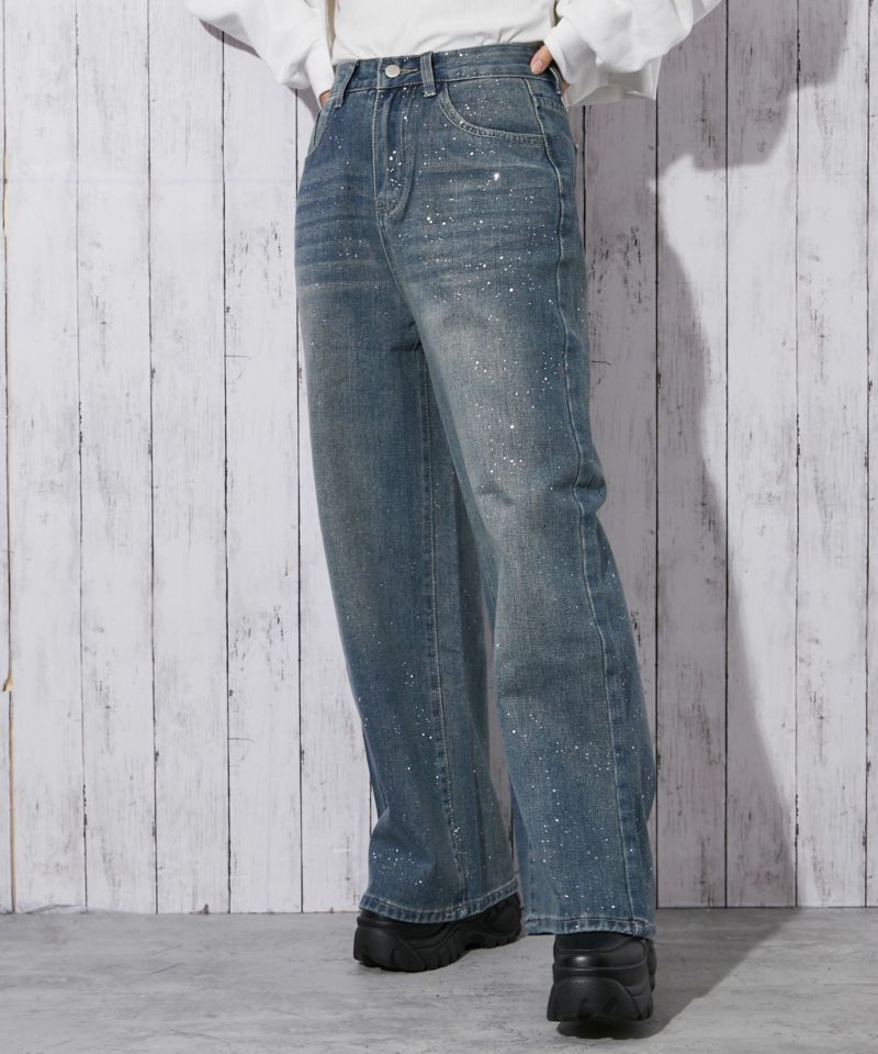 全体にラメ飛ばし加工を施し、光に当たるとほのかにきらめくデニムパンツ。