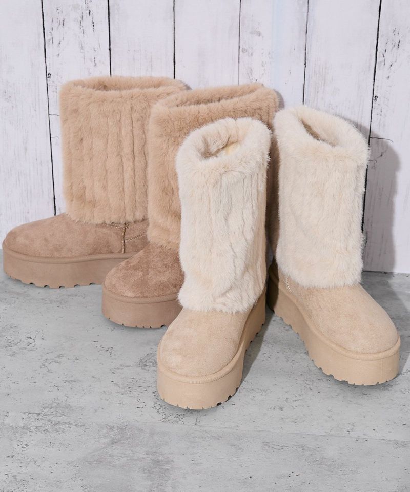ボリューム感たっぷりのファー切り替えデザインが目を惹くロング丈ブーツ。内側はふわふわの裏ボアで暖かさも抜群。厚底ソールでスタイルアップ効果もあり、冬の主役級アイテムに。