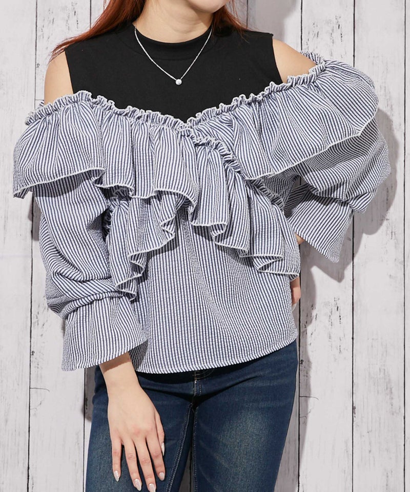 カタアキデザインとボリュームフリルをドッキングした、存在感たっぷりのガーリー×韓国系トップス。