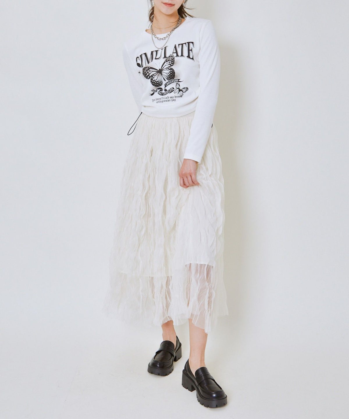 他の画像を見る 《ウェーブチュール×透け感レイヤード》レディース ロングスカート フレアシルエット 春夏秋冬 通常価格 ¥ 6,589 のところ 販売価格 ¥ 3,294 税込 カートに入れる お気に入りに登録する