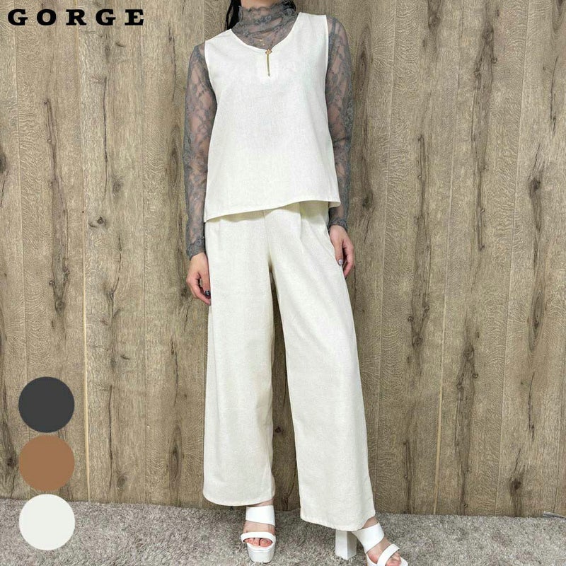 さらりとした素材感ある生地を使用した、きれいめテイストの人気2点セット。フロントのゴールドジップはスタイリッシュな印象が叶う◎襟ぐりはゆるやかなクルーデザインに、ややAラインシルエットが着心地良い♪パンツはフロントタックで細部まで美脚に見えるシルエットをメイク。
