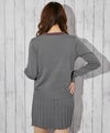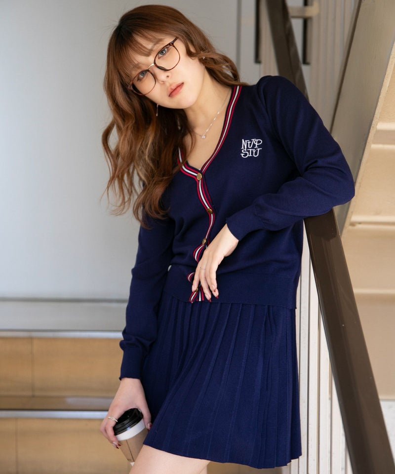 Vネックカーディガンとプリーツスカートのセットアップ仕様。
