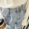 タックが入ったようなデザインに見える調整フック付き調整付きダメージデニムパンツが登場★オールシーズン履けるダメージパンツ♪サイズの調整がお洒落にさり気なく出来ちゃう◎フックに引っ掛けると自然にヒップにボリュームが出るのでウエストがより引き締まって見えてスタイルアップになります☆
