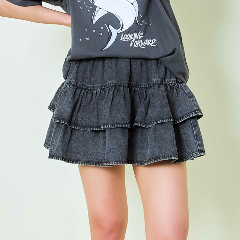段々になったティアードデザインが、ふんわりと広がる可愛らしいシルエットを演出。軽やかな印象ながらも、デニム素材でカジュアルに落とし込まれているから、甘すぎず着やすいのがポイントです。ウエストはすっきりとしたデザインで、トップスインも映えるスタイルに。ミニ丈でもスカパン仕様なので、安心して着こなせます♪