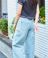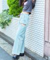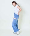 太もも部分に大胆なカットアウトを施し、肌見せの抜け感を演出。切りっぱなし風のディテールやリボンの結びデザインがアクセントとなり、カジュアルさの中にモード感も漂います。美脚効果のある程よくフィットするシルエットと、裾にかけてやや広がるフレアラインが脚長効果も発揮◎柔らかめのデニム素材で履き心地も抜群です。