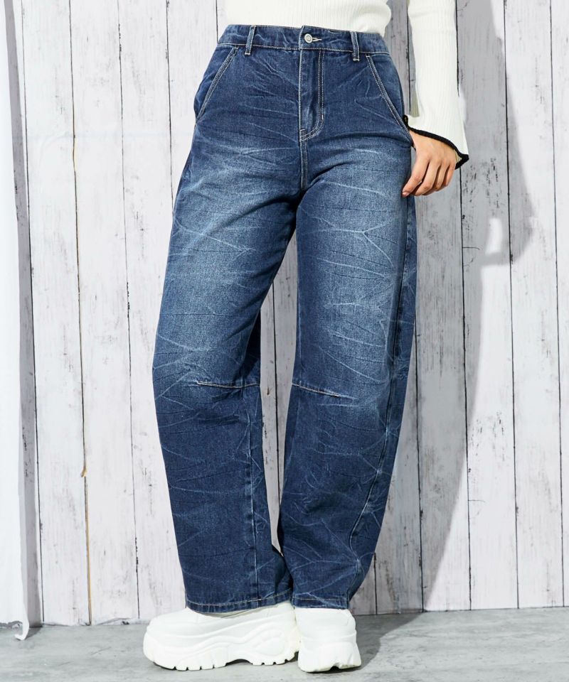 立体的な丸みを帯びたバレルラインが特徴のデニムパンツ。加工感のある仕上がりで、一本で旬なスタイルが完成します。