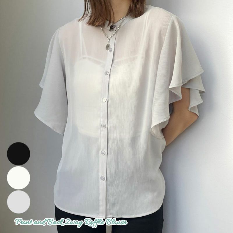 前後2wayでスタイリングできるラッフルブラウスが登場★透け感がありとろみのある柔らかな質感が可愛いらしいアイテム♪動きのあるフレアの袖が女性らしさを演出◎様々なシーンで活躍してくれます!