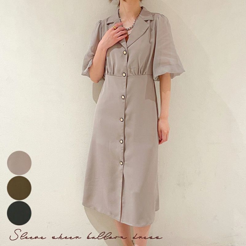 バルーンスリーブ部分をシアーな生地で切り替えたワンピースが登場★深めのVネックから覗くデコルテが大人可愛いく一枚でさらっと着やすいデザインに♪フロントに並べたボタンがレトロな印象を与える今年らしい一着◎パフスリーブにAラインスカートが品のあるアイテムです☆