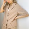 メンズライクな少し長めの半袖が大人っぽい印象のコットンライクジャケットが登場★開襟のデザインで顔周りをすっきりみせてくれる♪セットアップではもちろん、デニムパンツやスキニーパンツなどを合わせるなど単体でもコーディネートが広がる◎ショートパンツ(2323576)とセットアップでもご着用していただけます☆