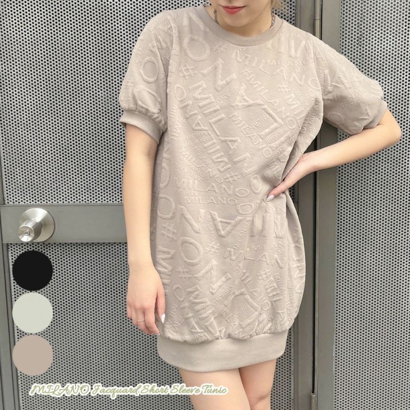 MILANOのロゴがオシャレなジャガードチュニックが登場★ストレス無く着れるサイズ感で、これからの時期に大活躍なアイテム!一枚でワンピース風に着ても、パンツと合わせてカジュアルに着ても可愛いチュニックです!