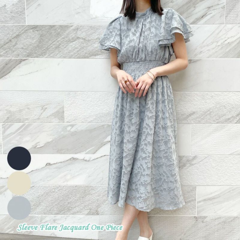 上品なフラワーモチーフのジャガード素材が特徴的なワンピースが登場★華やかなフレア袖がポイント♪バックネックには大胆にカッティングを施し、ヘルシーな肌見せを演出◎シアーな素材感がシーズンムードを高めてくれるジャガード生地を使用した、1枚で主役になるワンピースです☆