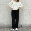 ハーフジップでメンズライクなシンプルコーデ!ハーフZIP短丈ニットプルオーバーが登場★ハーフジップを折り返して大きな襟を作れます♪ニットは柔らかく細かい素材です◎デニムで定番カジュアルに、タックパンツも今っぽい着方です☆