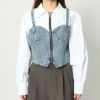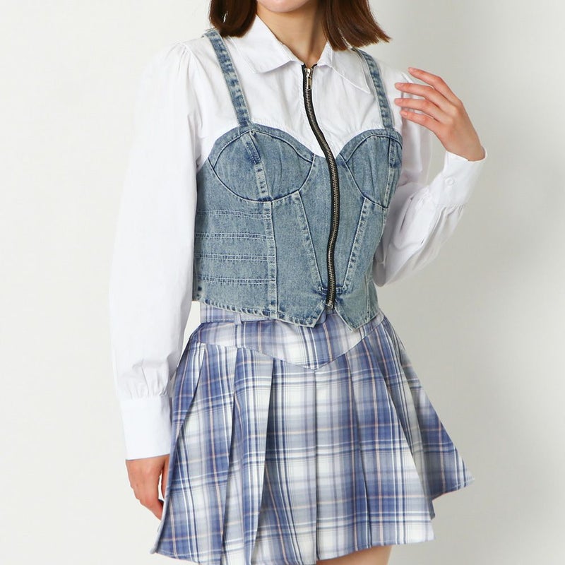 ジップタイプのビスチェドッキングシャツ。トレンドのデニムビスチェもレイヤード風シャツがあれば1枚でスタイリングが完成します。ジップタイプなので自由な着こなしで個性もプラスされるオシャレ度UPの万能アイテム★スッキリしたパンツスタイルで大人っぽカジュアルコーデが得意です!