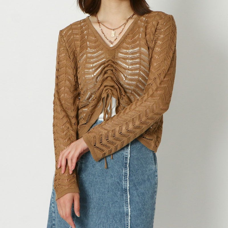 上品な透かし編みが目を惹く女性らしいシアーニットが登場。ゆったりとしたシルエットはいつものボトムにサラッと羽織るだけでこなれ感を演出できます♪フロントのドロストでお好みの丈感に調節ができるので、インナーのTシャツやキャミソールとの着こなしをお楽しみください◎