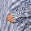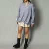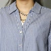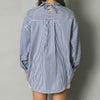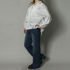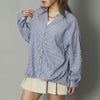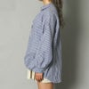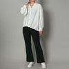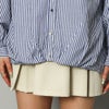 抜き衿とバックレースアップが首元を女性らしく演出するブラウス。レースアップは共布のリボンで控えめなデザインになっています。フロントはマルチボタンで遊び心もプラス。前身の裾にタックをあしらったフロントインしたようなシルエット。