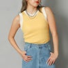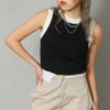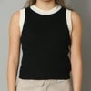 配色のカラーリングが目を惹くリブニットのタンクトップ。程よくボディラインにフィットするタイトシルエットでメリハリ感をプラス。やや短丈で目線が上がり、スタイルアップも簡単に叶う。ハイゲージで滑らかな風合いの伸縮性のあるニット素材で上品に見える事間違いなし。