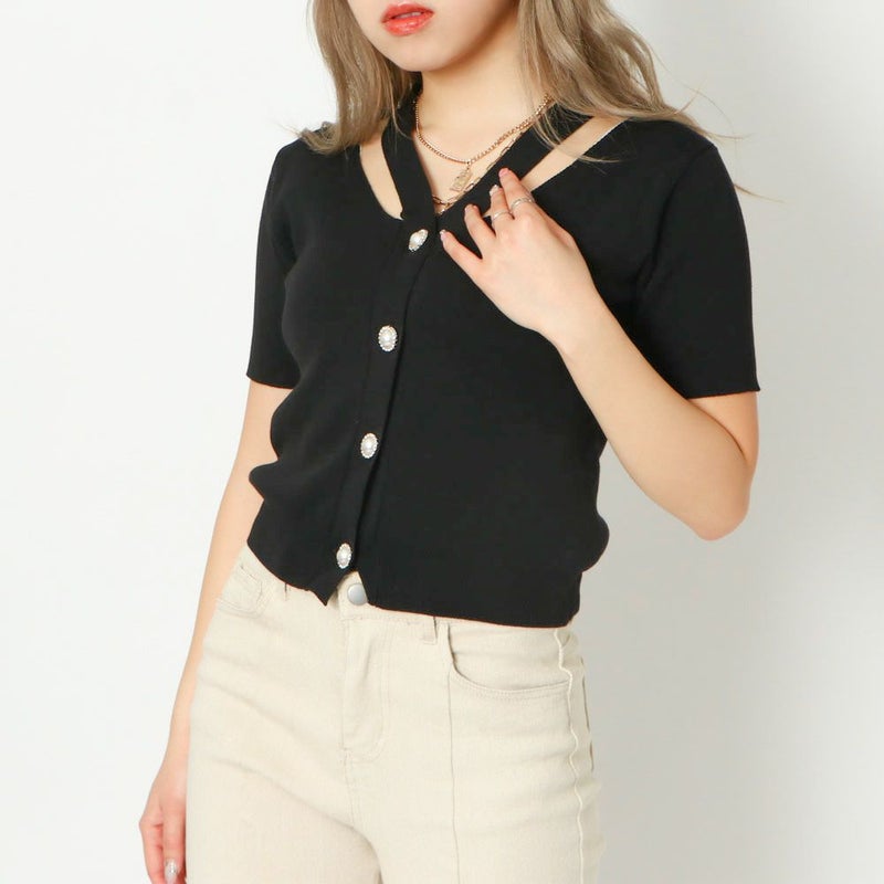 さりげない肌見せが叶うレディライクなデザインカーディガン★ハイゲージニットにパールボタンの組合せで大人感を演出、さらに首元のスリットで女性らしさをプラス。スカートはもちろんパンツスタイルでも華やかな着こなしが叶います。