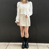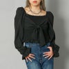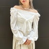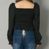 ウエストにシャーリングを入れたシルエットが印象的な、女性らしい雰囲気のブラウス。フロントに添えたリボンが程よく愛らしさをプラス。スッキリとしたスクエアネックがデコルテを華奢に見せ、ふんわりとしたパフスリーブで好バランスに。袖を落としてオフショルダーにもアレンジでき、肌見せの分量でがらりと表情が変えられる万能な一着。