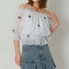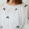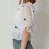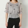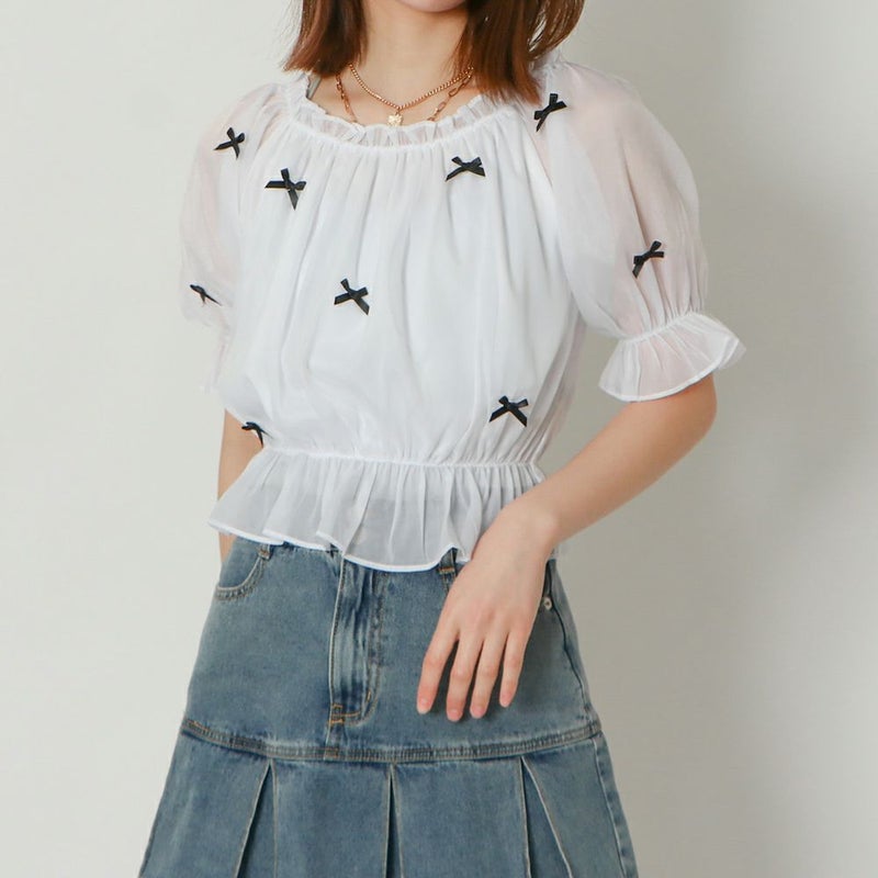 光沢感のある生地が華やかなシアートップス。上品な小さめリボンが散りばめられた大人フェミニンなアイテムです!程よいボリューム感がタイトなボトムと相性バツグン★