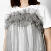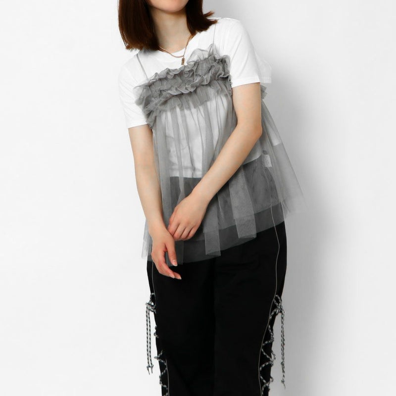 チュールを二段にあしらった大人フェミニンなキャミソール。レギュラー丈でインナー合わせにも困らない◎どんなボトムを合わせても、トレンドをおさえたお洒落な着こなしにランクアップ。